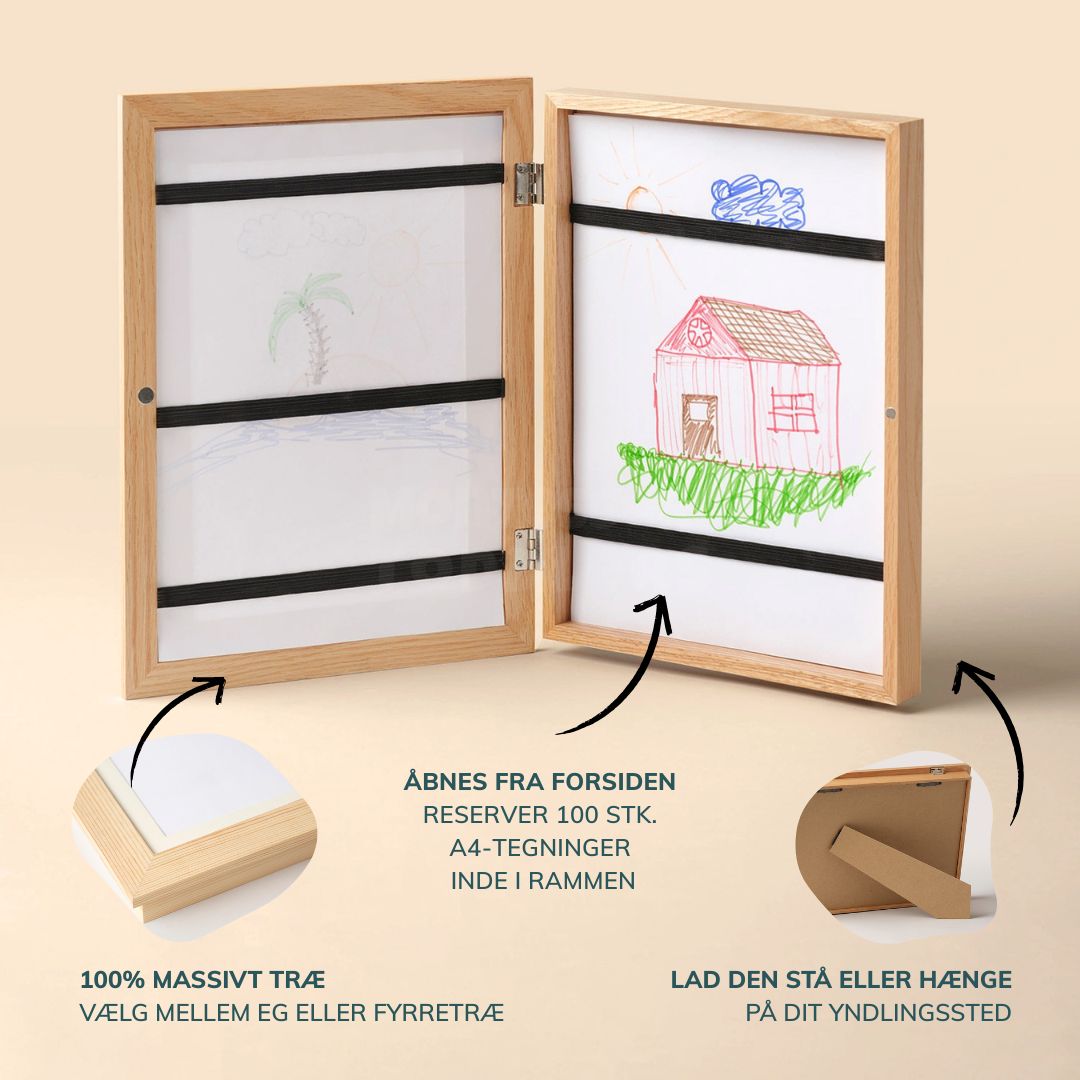 Hver tegning fortæller en historie. Med vores ramme kan du nemt vise dagens yndlingsværk frem – og udskifte det på sekunder. En skjult magnetisk lukning holder det hele på plads, og designet passer ind i både børneværelset og stuen.